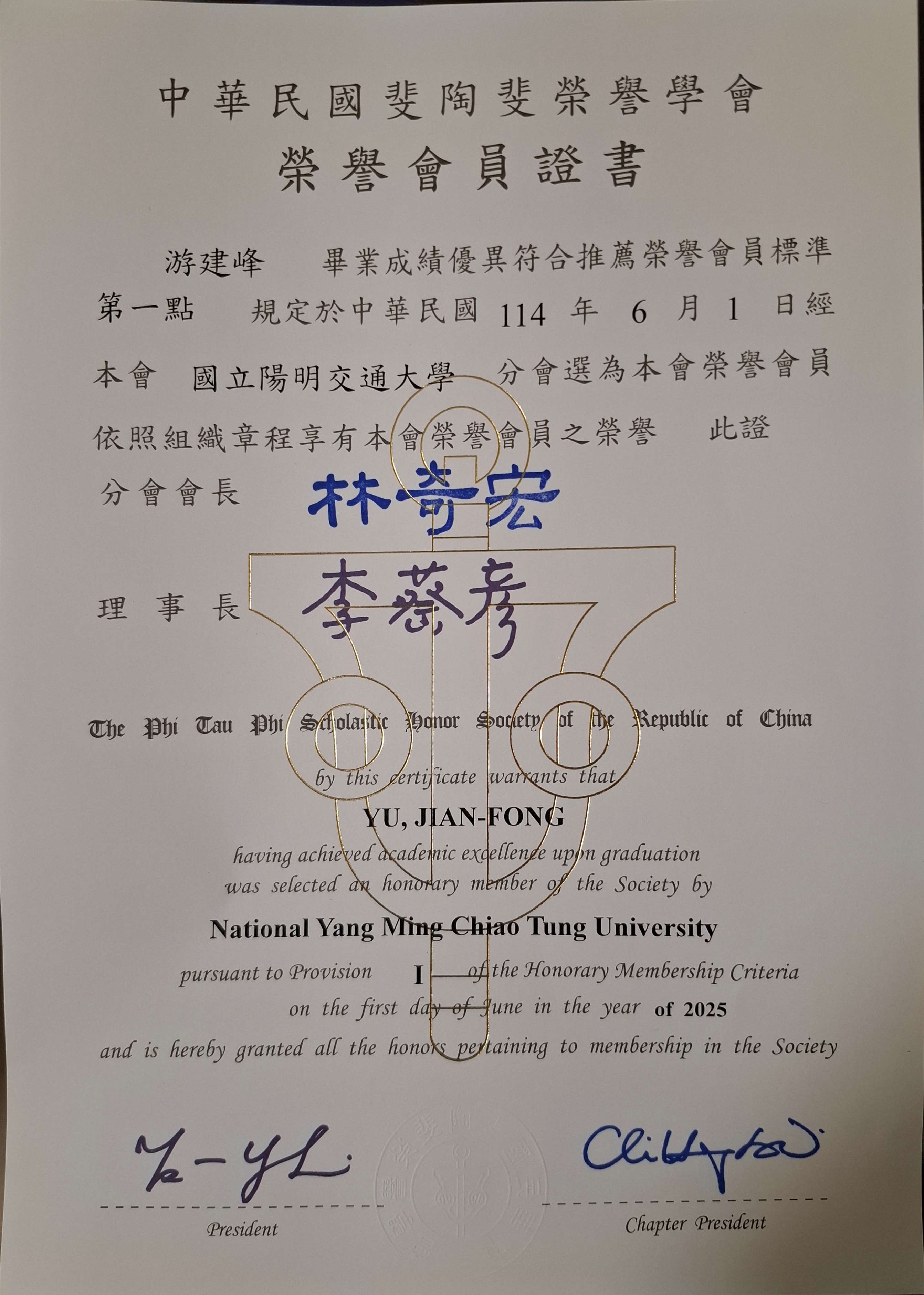 - 2025 Honorary Member of the Phi Tau Phi Scholastic Honor Society of R.O.C.